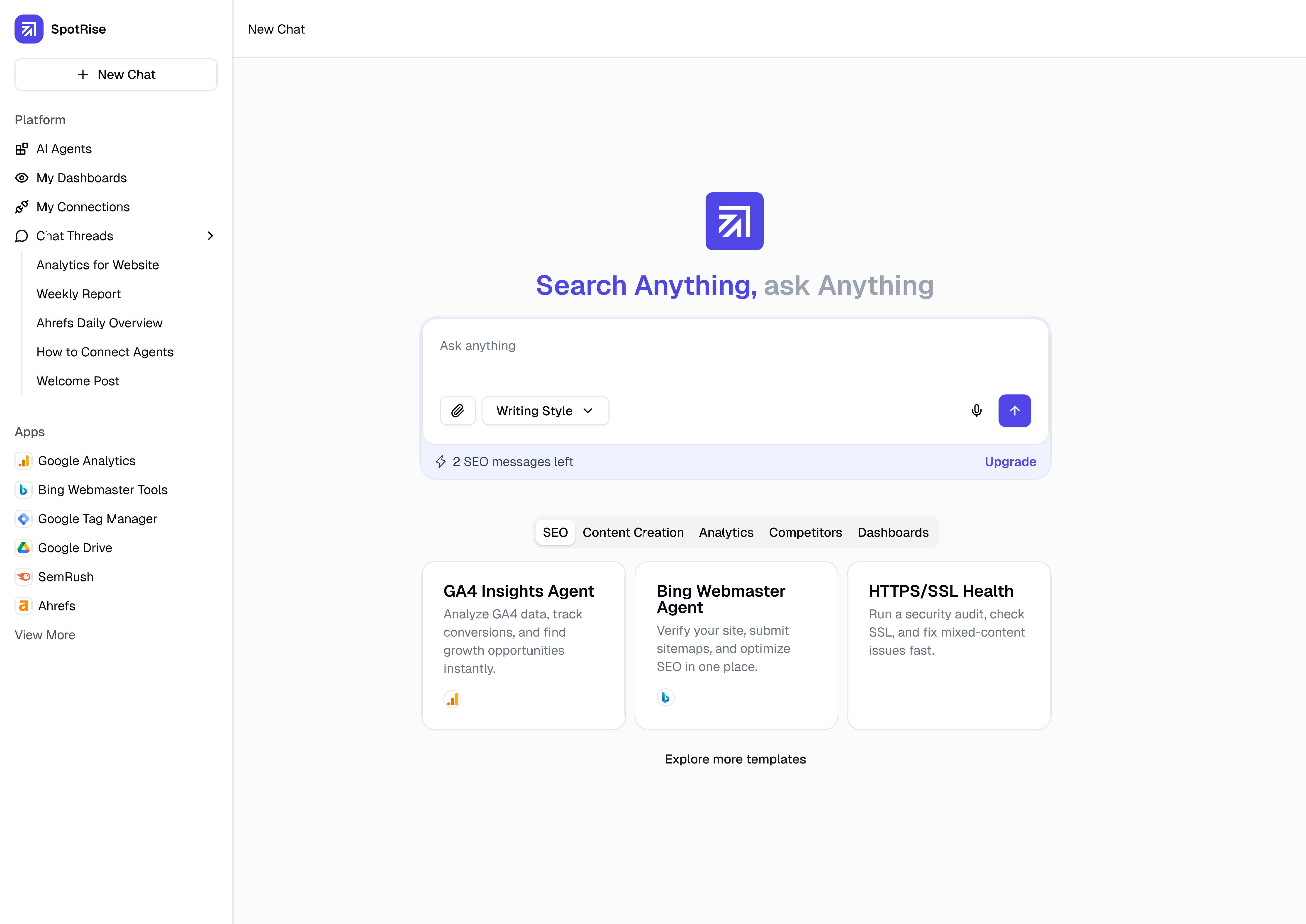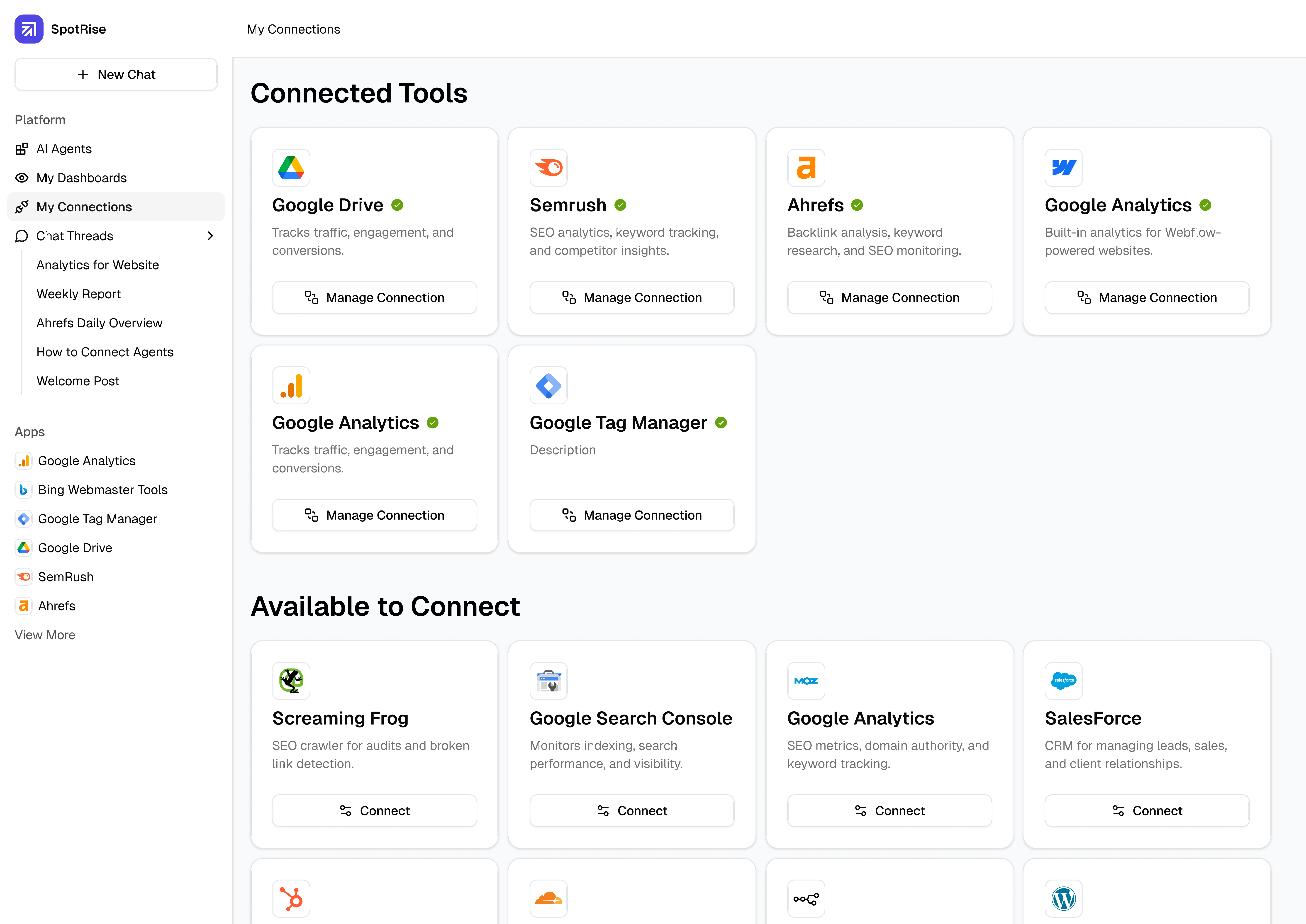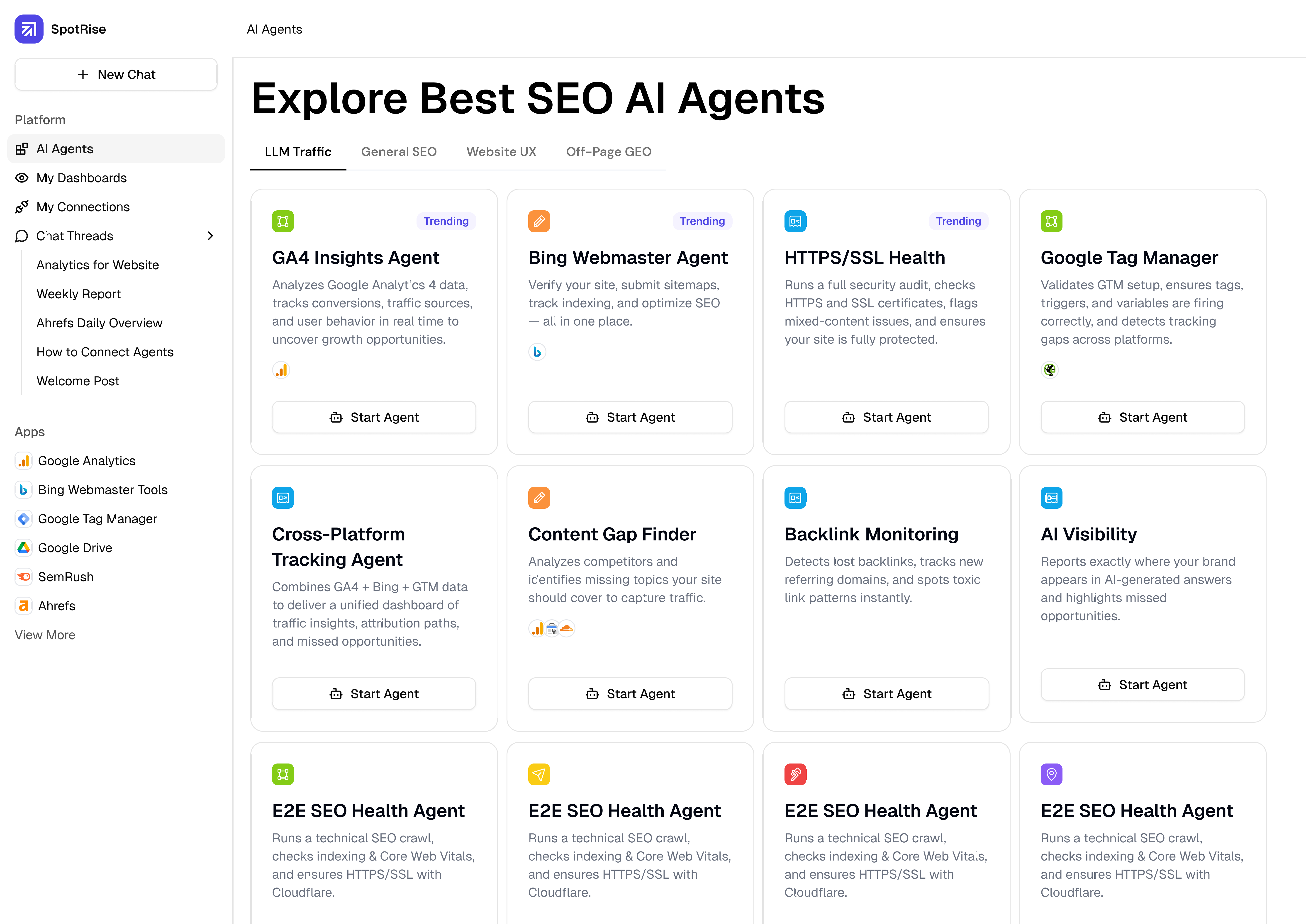 Ask SpotRise what to automate — audits, reports, integrations, tracking — and it builds your agent in minutes.