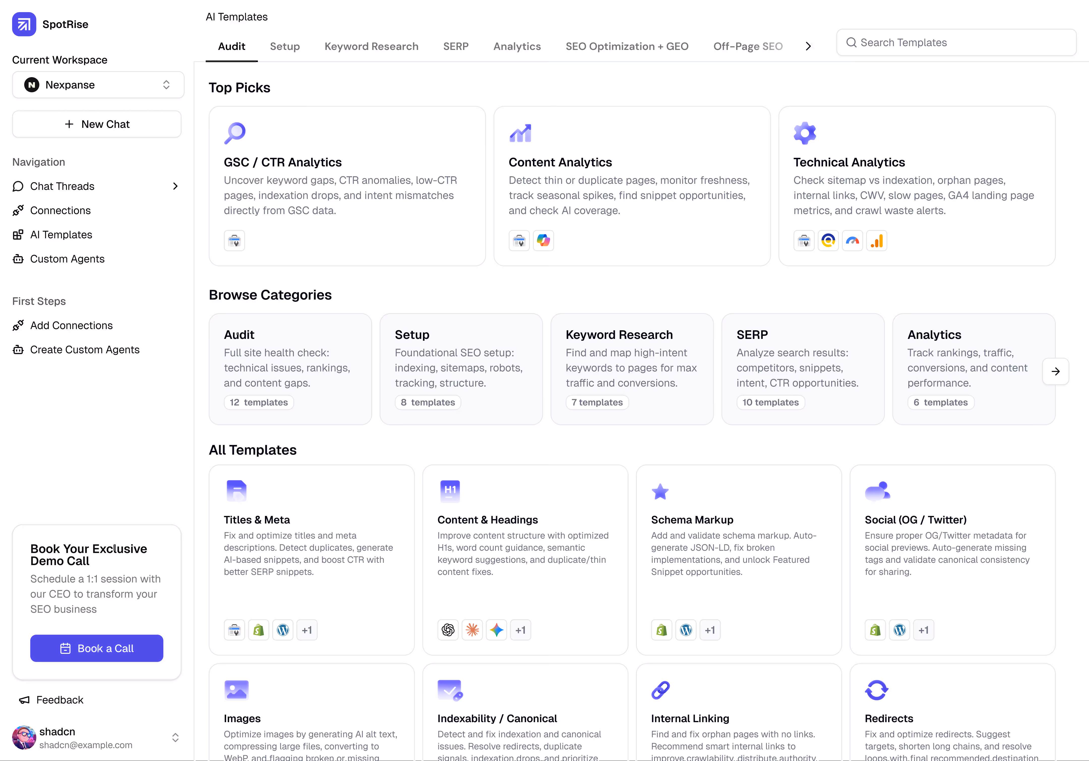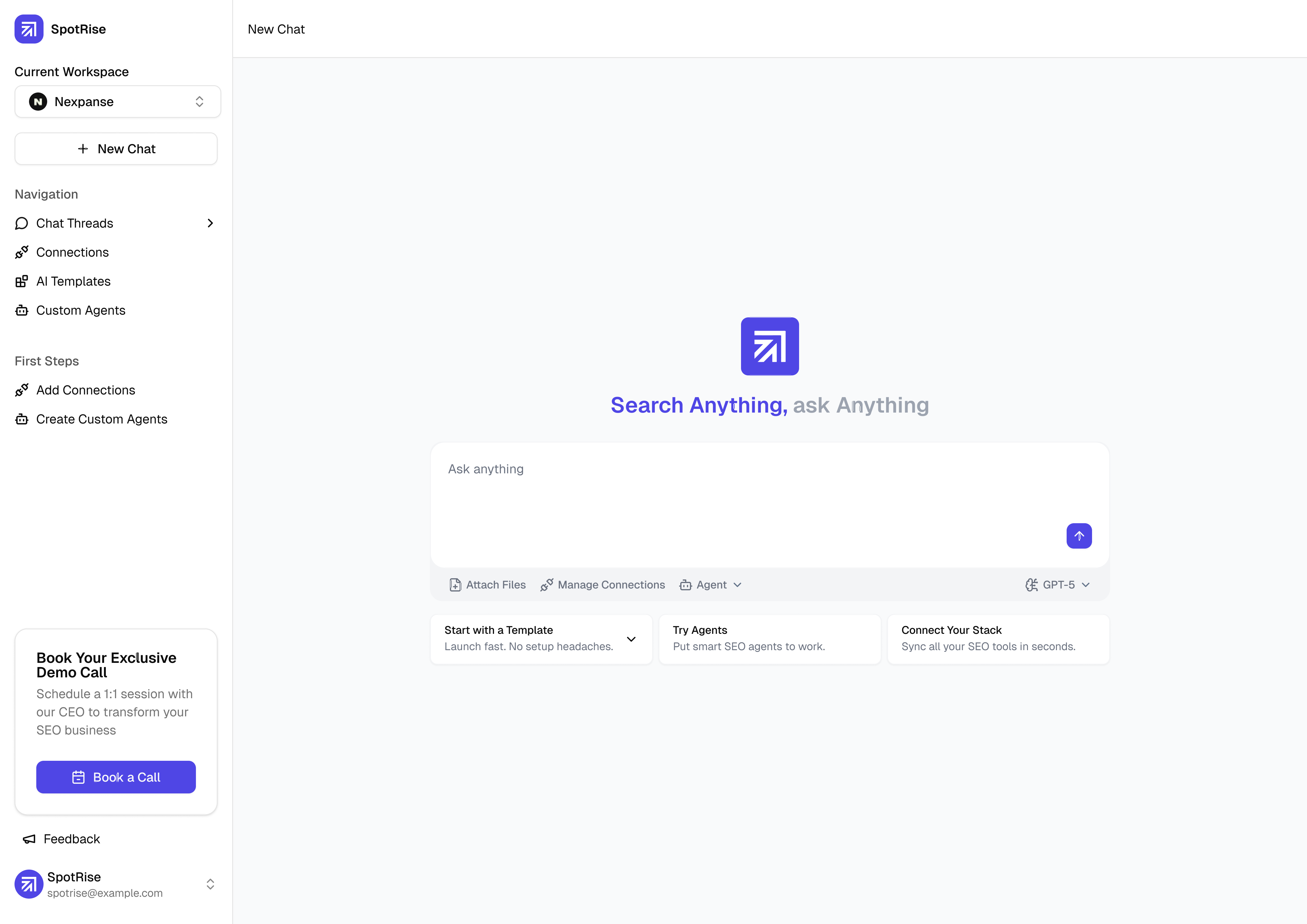 Ask SpotRise what to automate — audits, reports, integrations, tracking — and it builds your agent in minutes.