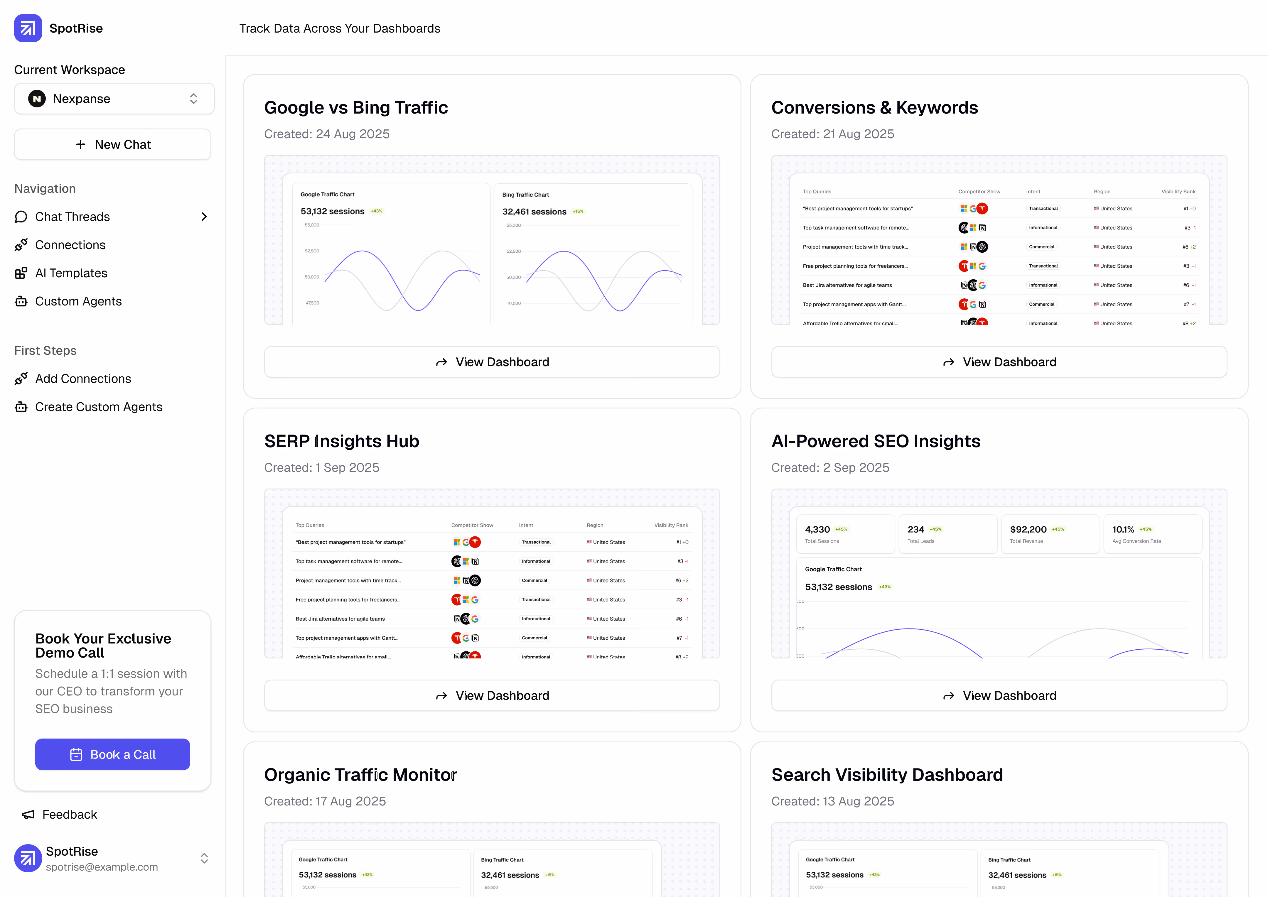 Say what you need — audits, traffic tracking, ranking reports — and SpotRise handles it all. No endless clicking, no disconnected tools, no extra hires.