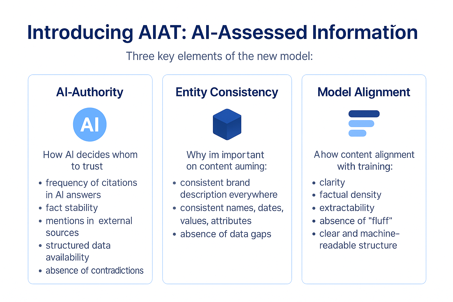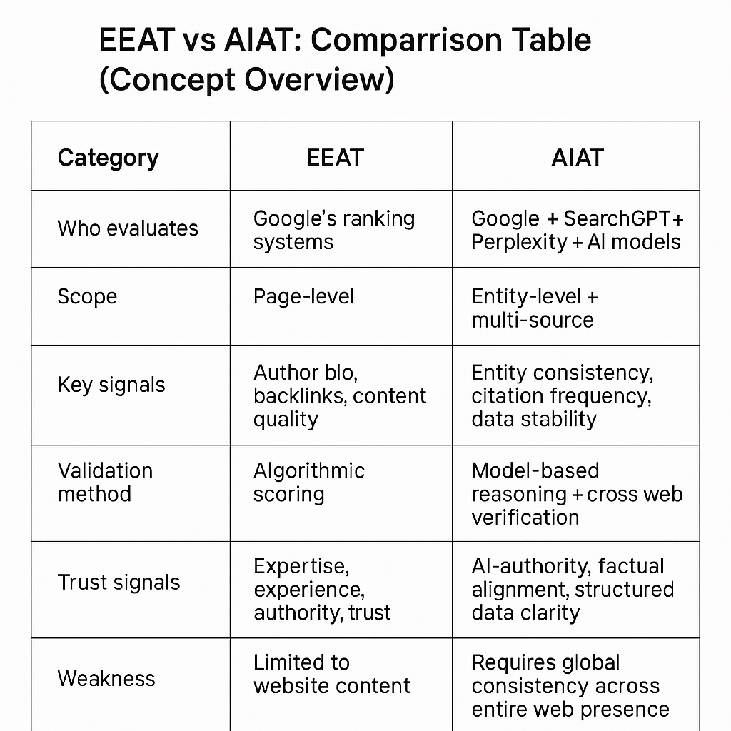 AIAT is the evolution of EEAT — a framework that reflects how AI models (not just Google) evaluate trustworthiness, authority, and factual reliability.