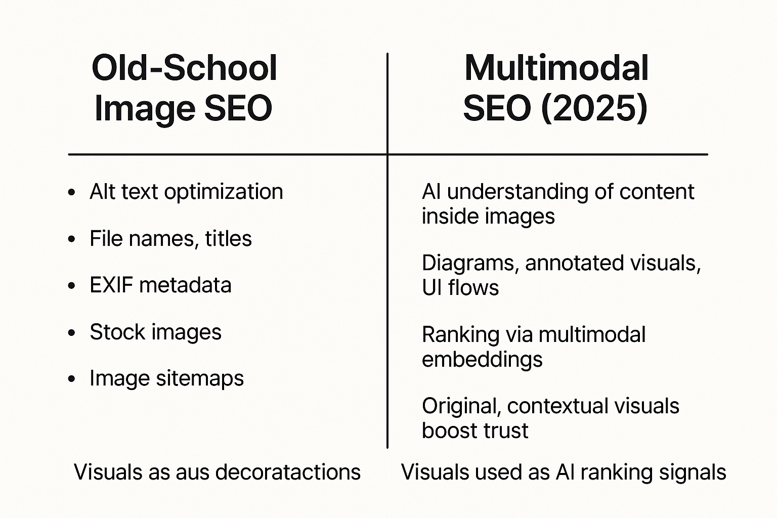 Multimodal search means your page is evaluated holistically: factual clarity, visual clarity, design clarity — all at once.