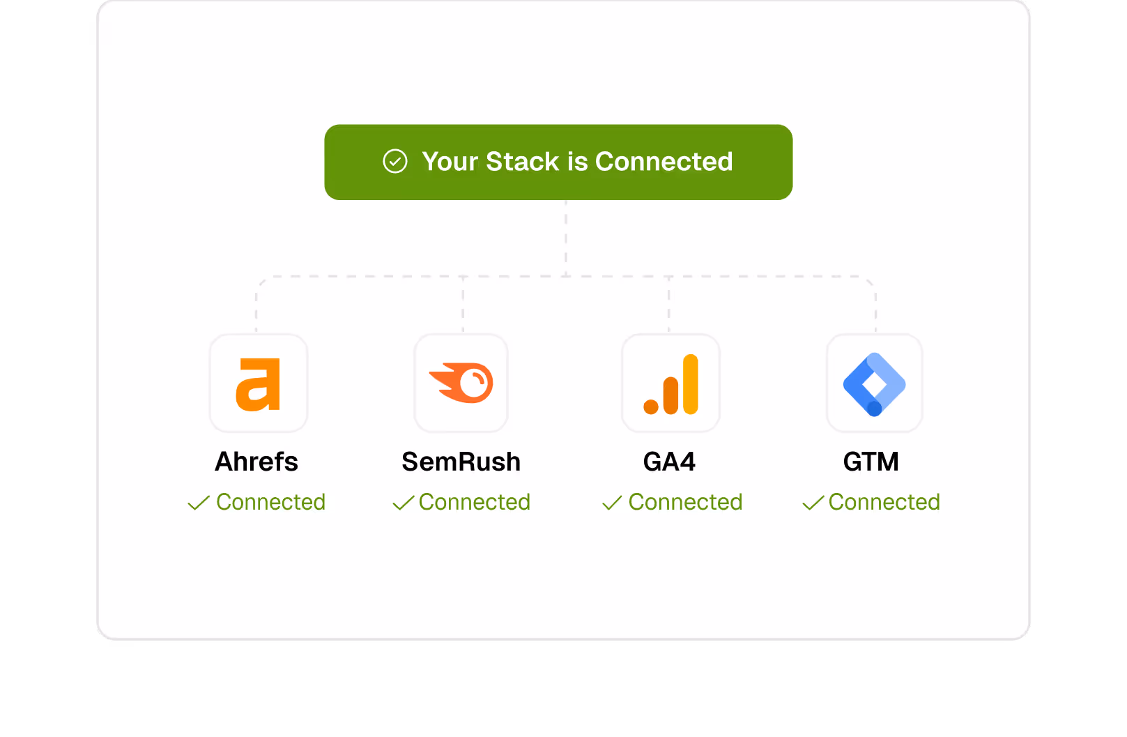 Connect GA4, GSC, Bing, SemRush, and hundreds of other tools in seconds — no manual work.