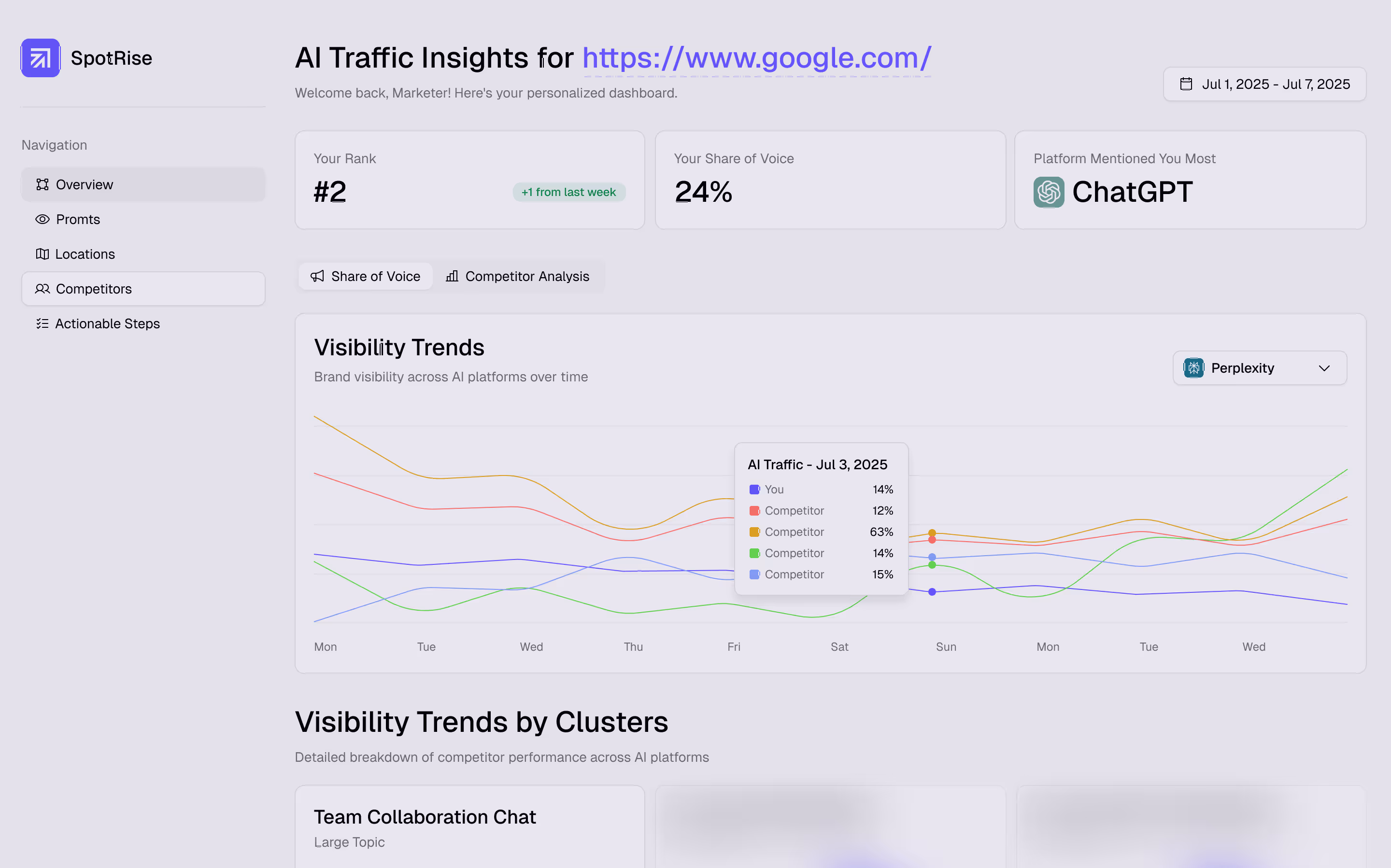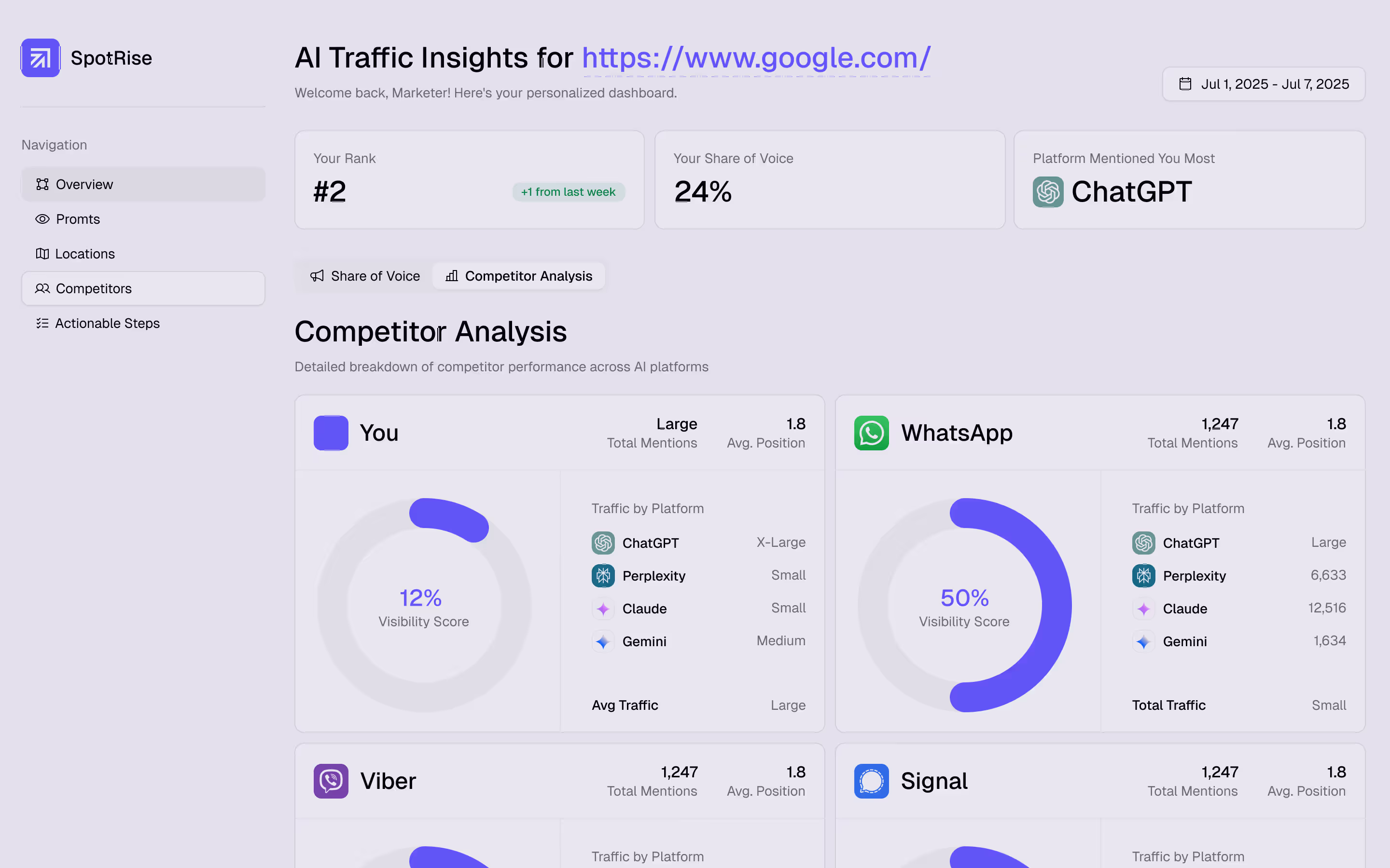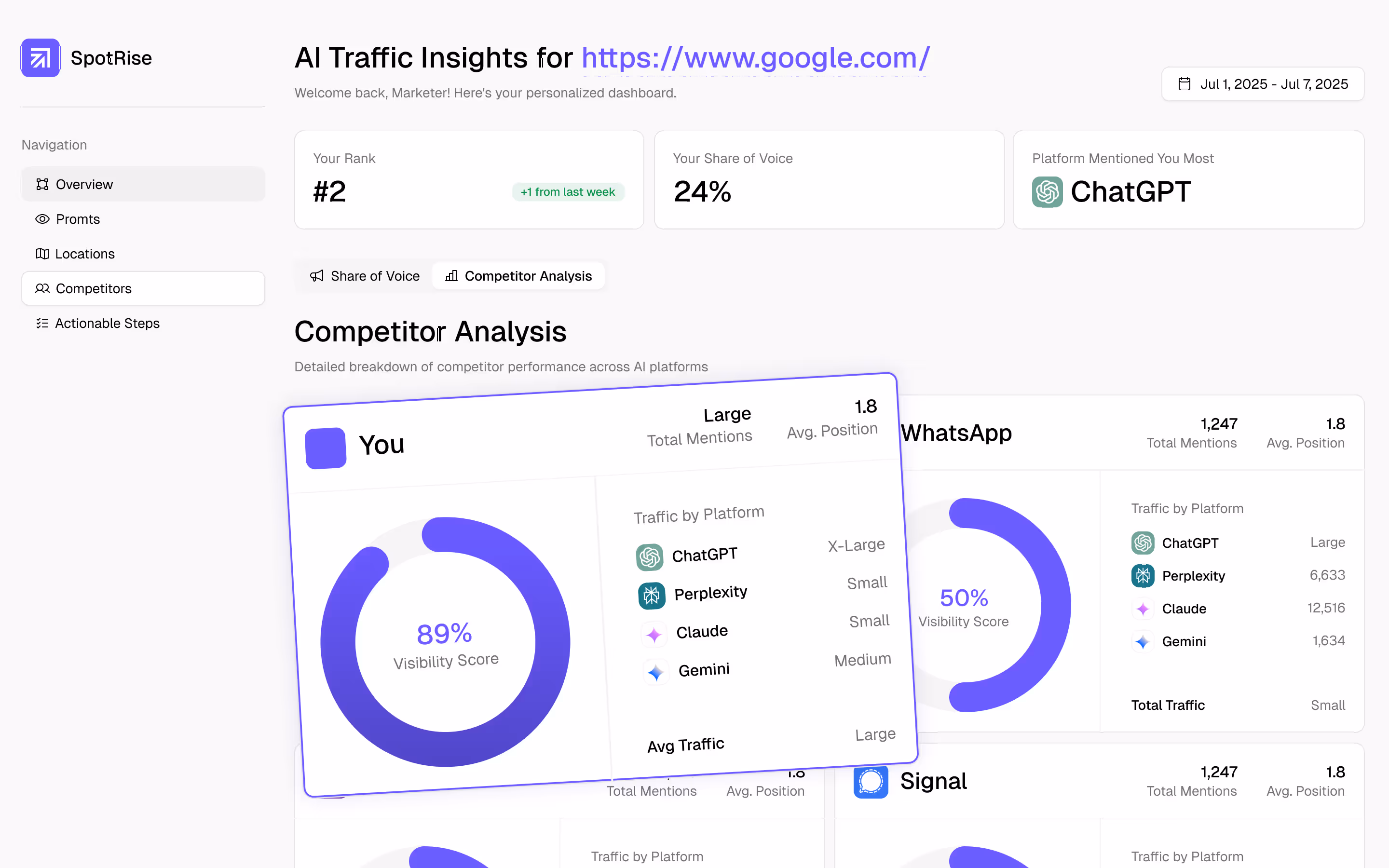 Monitor how ChatGPT, Perplexity, and Claude mention (or ignore) your brand. Uncover missed opportunities, track competitors, and take back control in the era of AI-driven discovery.