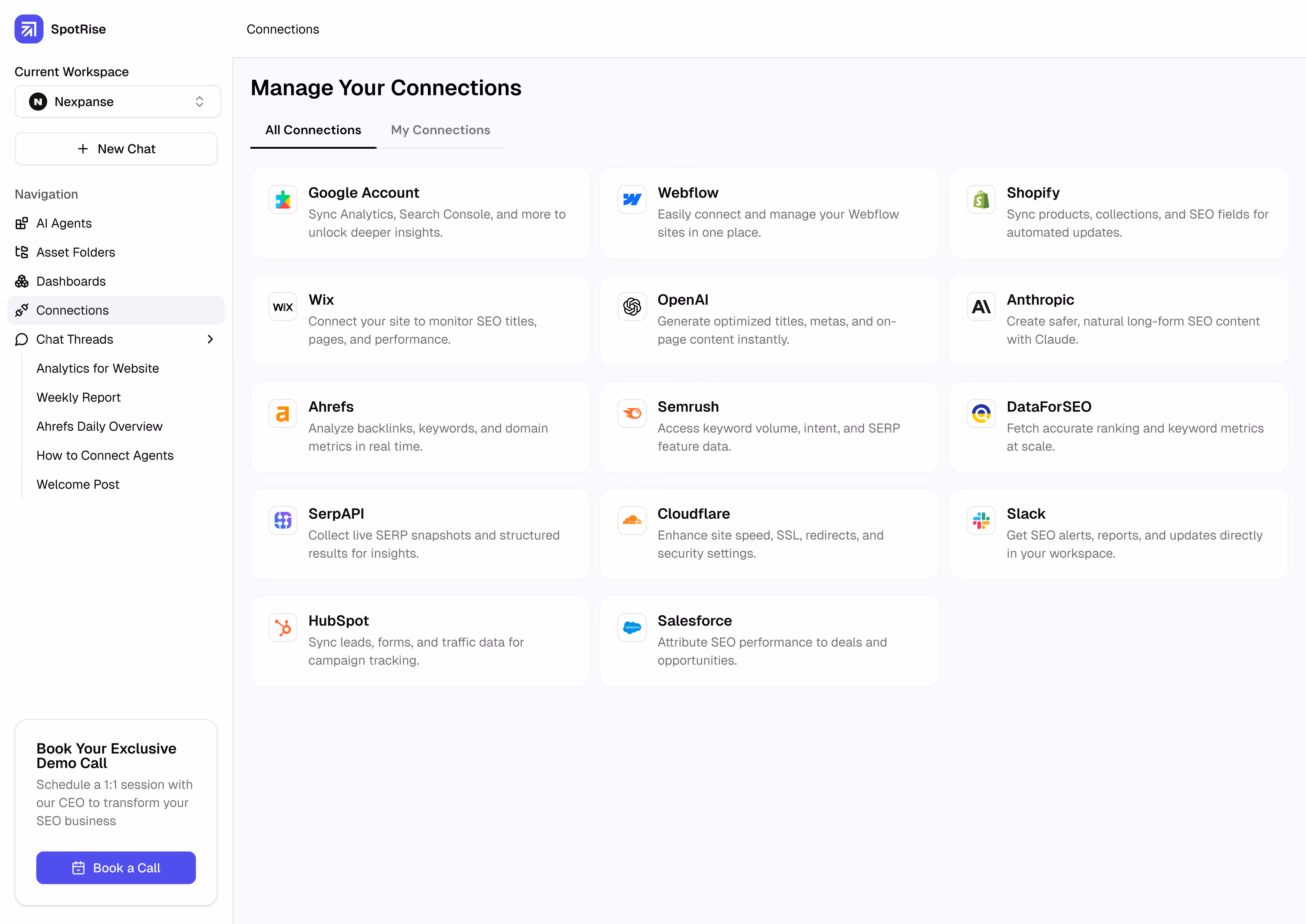 Integrate GA4, GSC, Bing, Semrush, CMS, CRM, and hundreds of other tools instantly — no coding, no setup headaches.