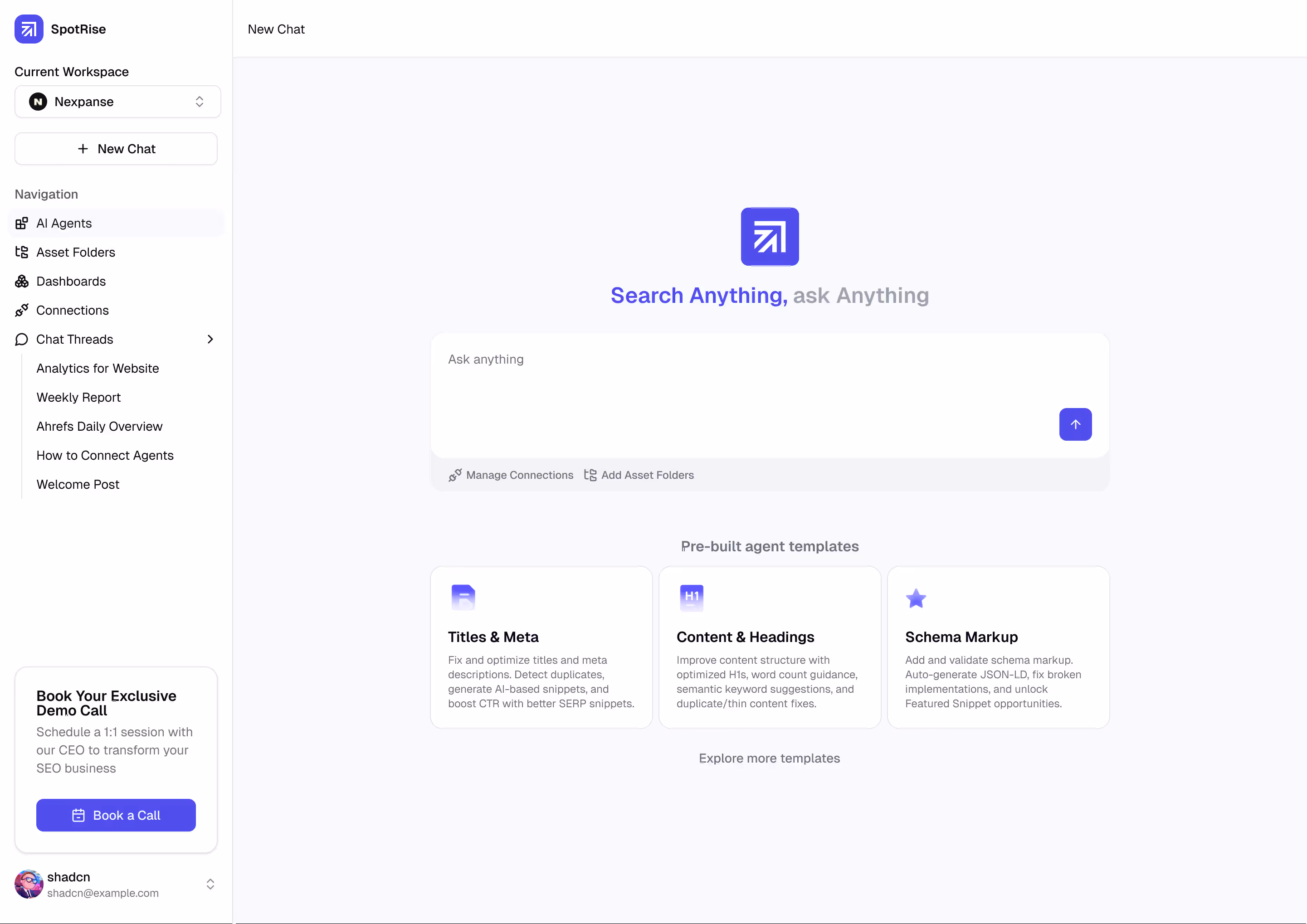 Ask SpotRise what to automate — audits, reports, integrations, tracking — and it builds your agent in minutes.